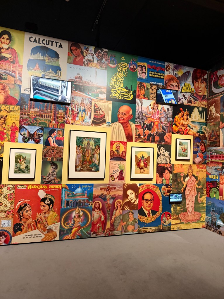 Switching gears to thousands of miles away, the exhibit, Divine Color: Hindu Prints from Modern Bengal explores the origins of popular prints and their impact on Indian pop culture, religion, and society. The exhibition had collages of popular images, taking me back to a time where these images a part of everyday life in India. I recognized deities, political figures, movies stars from yesteryear, all coming together in a burst of color.